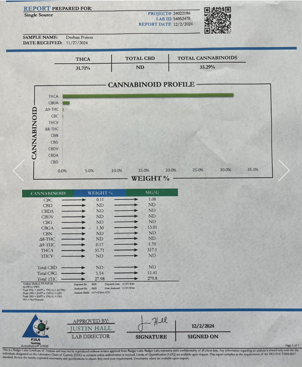 At 32% THCa, she is the queen of all sativas. Hard hitting and super gassy, Durban Poison is a pure sativa originates from the South African port city of Durban. It has gained popularity worldwide for its sweet smell and energetic, uplifting effects. Durban Poison is the perfect strain to help you stay productive through a busy day, when exploring the outdoors, or to lend a spark of creativity..